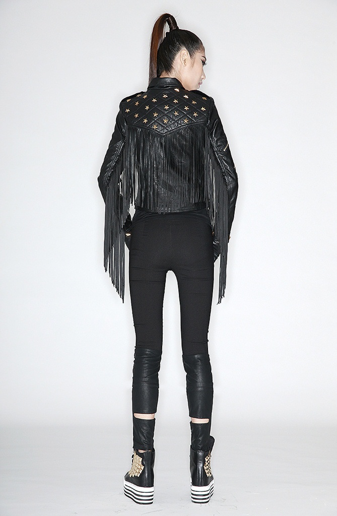 Bu edgy zımbalı püsküllü siyah deri ceketi hemen sepetinize ekleyin, her kombinle asi gücünüzü konuşturun – kaçırmayın!