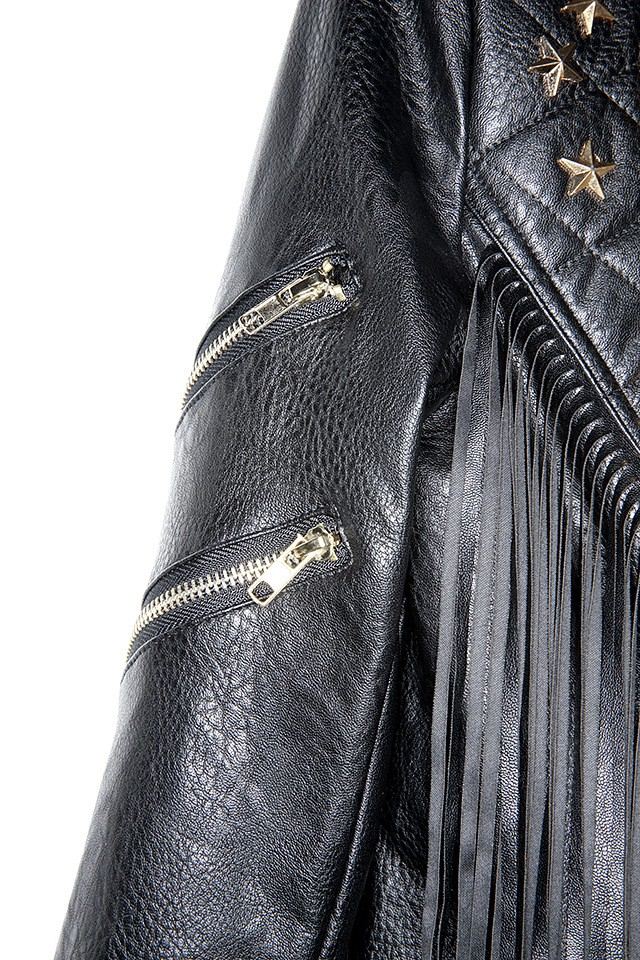 Edgy Zımbalı Püsküllü Siyah Deri Ceket
