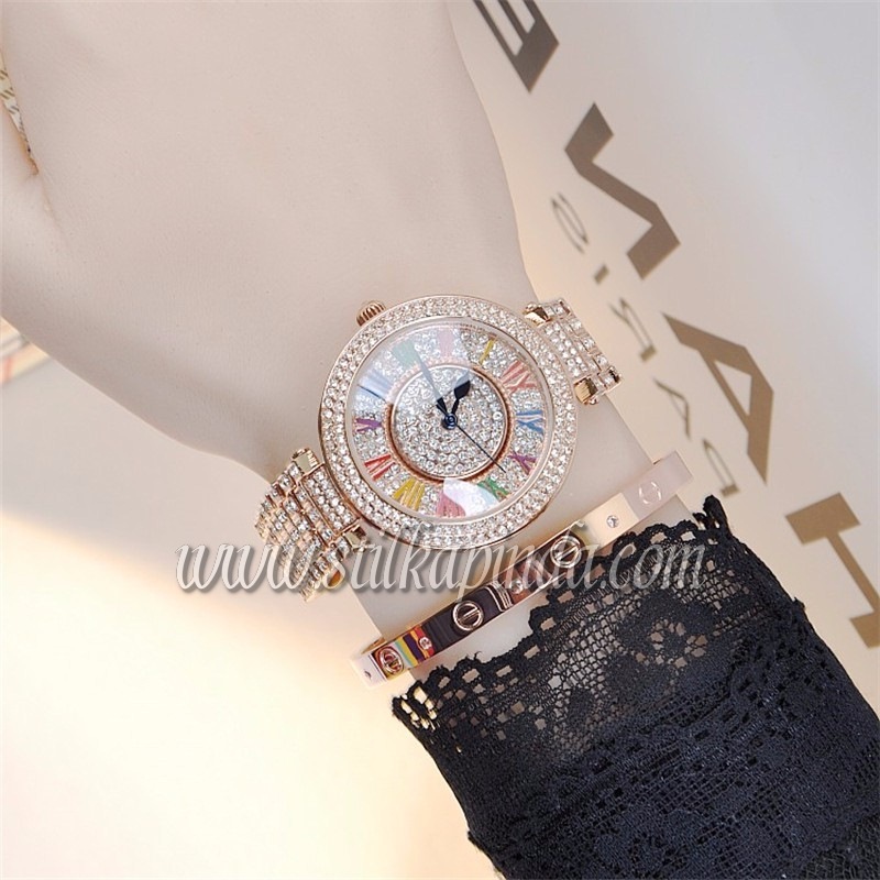 Paslanmaz çelik kasa dayanıklı ve parlaklığını uzun süre korur, çizilmelere karşı dirençlidir. Swarovski taşlar lüks ve ışıltılı bir görünüm verir, kadranı benzersiz kılar. Renkli romen rakamlar okunaklılık ve eğlenceli stil ekler. Su geçirmez yapı pratik kullanım sunar; analog mekanizma klasik ve güvenilir çalışır. Günlükten akşam kombinlerine uyum sağlar, kaliteli malzeme uzun ömürlü kullanım vaat eder.